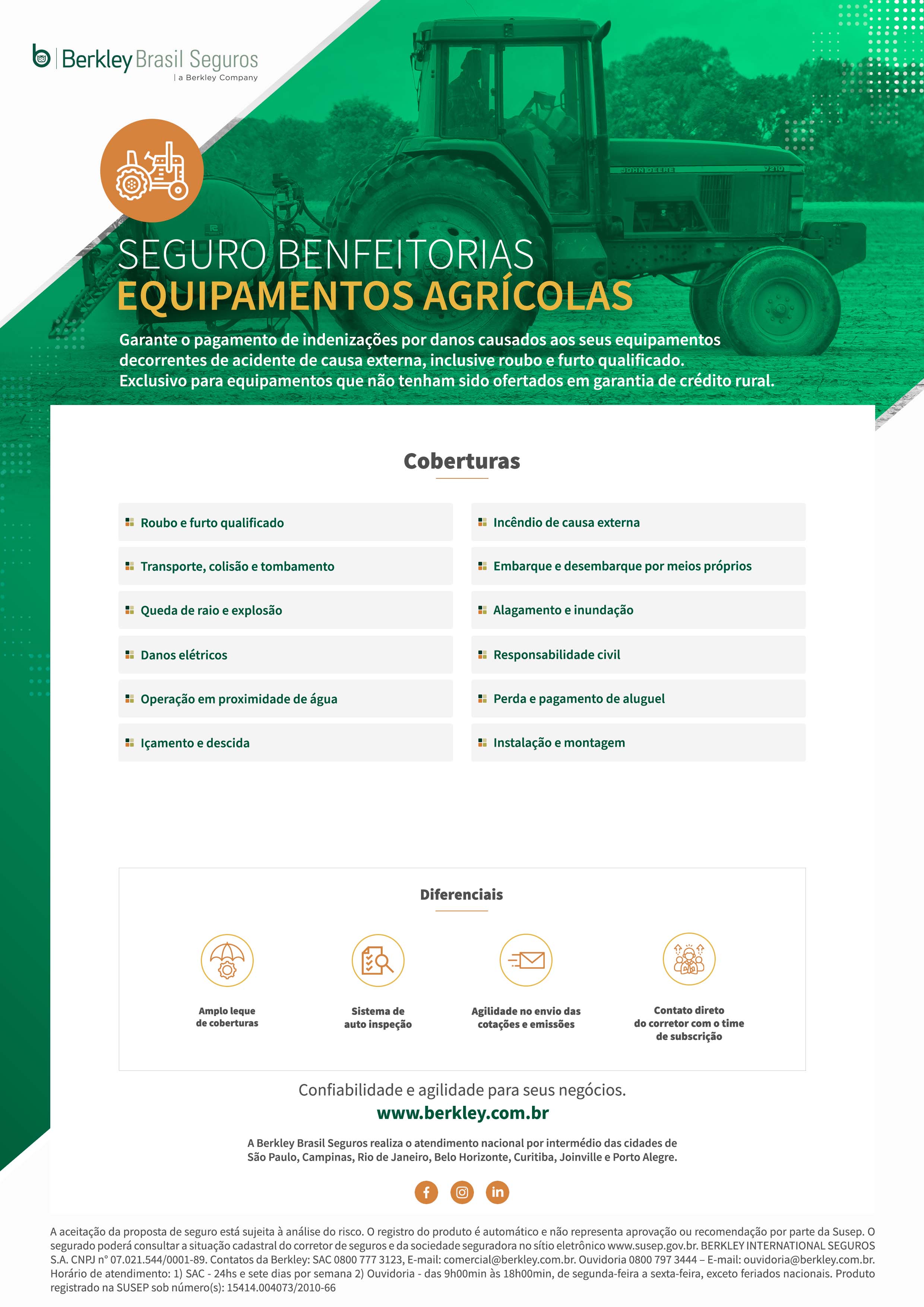 Garante o pagamento de indenizações por danos causados aos seus equipamentos decorrentes de acidente de causa externa, inclusive roubo e furto qualificado. Exclusivo para equipamentos que não tenham sido ofertados em garantia de crédito rural.