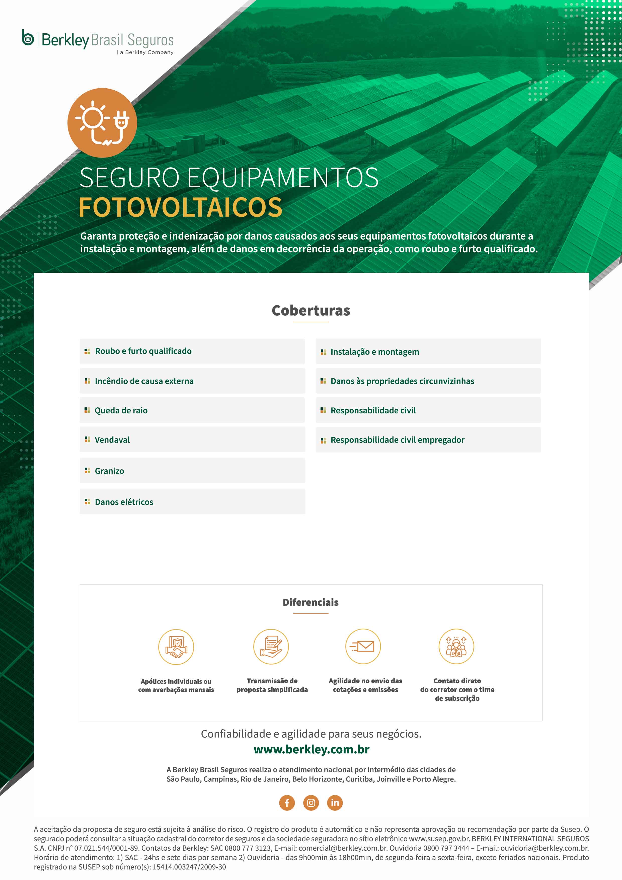 Garanta proteção e indenização por danos causados aos seus equipamentos fotovoltaicos durante a instalação e montagem, além de danos em decorrência da operação, como roubo e furto qualificado.