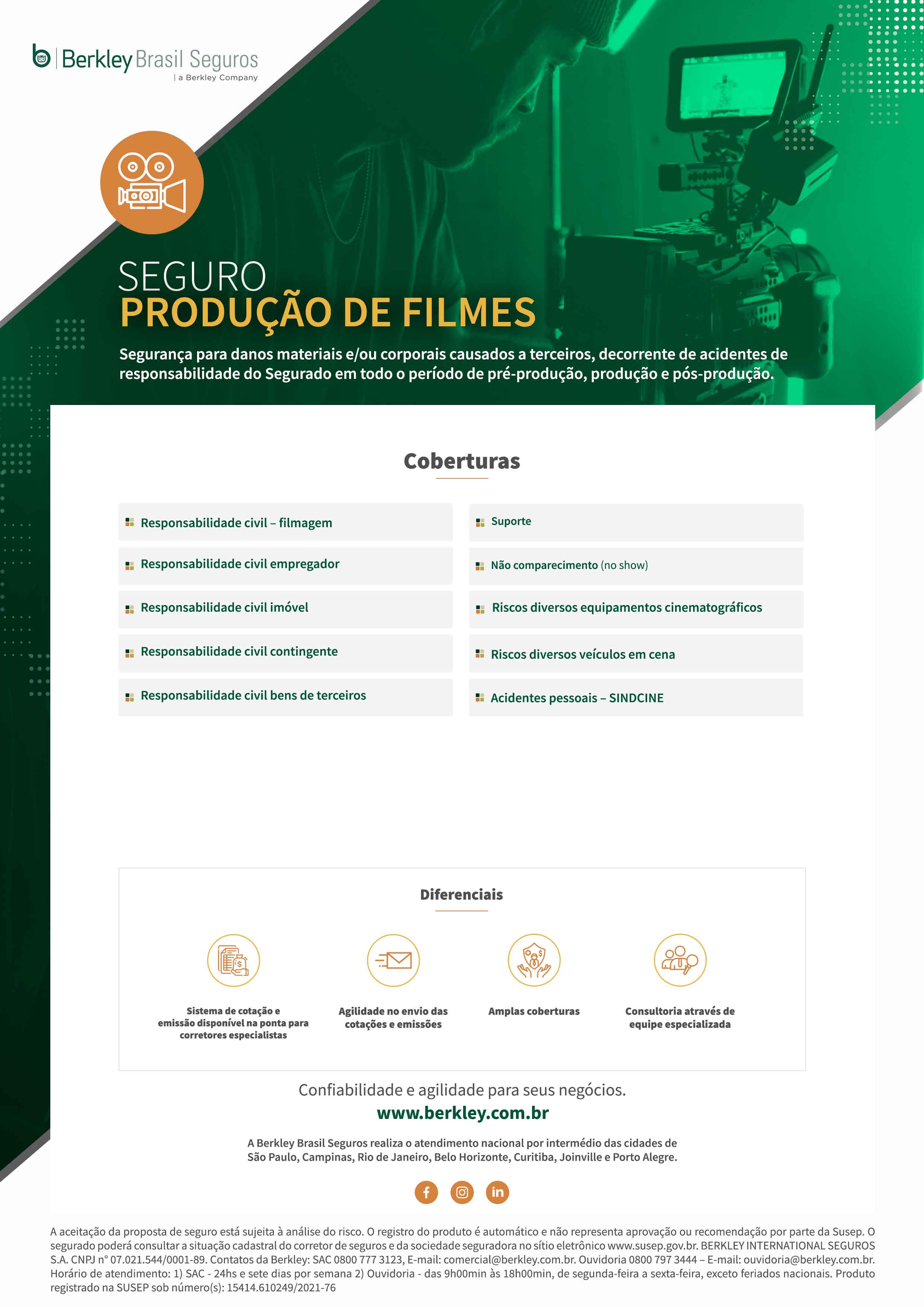 Segurança para danos materiais e/ou corporais causados a terceiros, decorrente de acidentes de responsabilidade do Segurado em todo o período de pré-produção, produção e pós-produção.