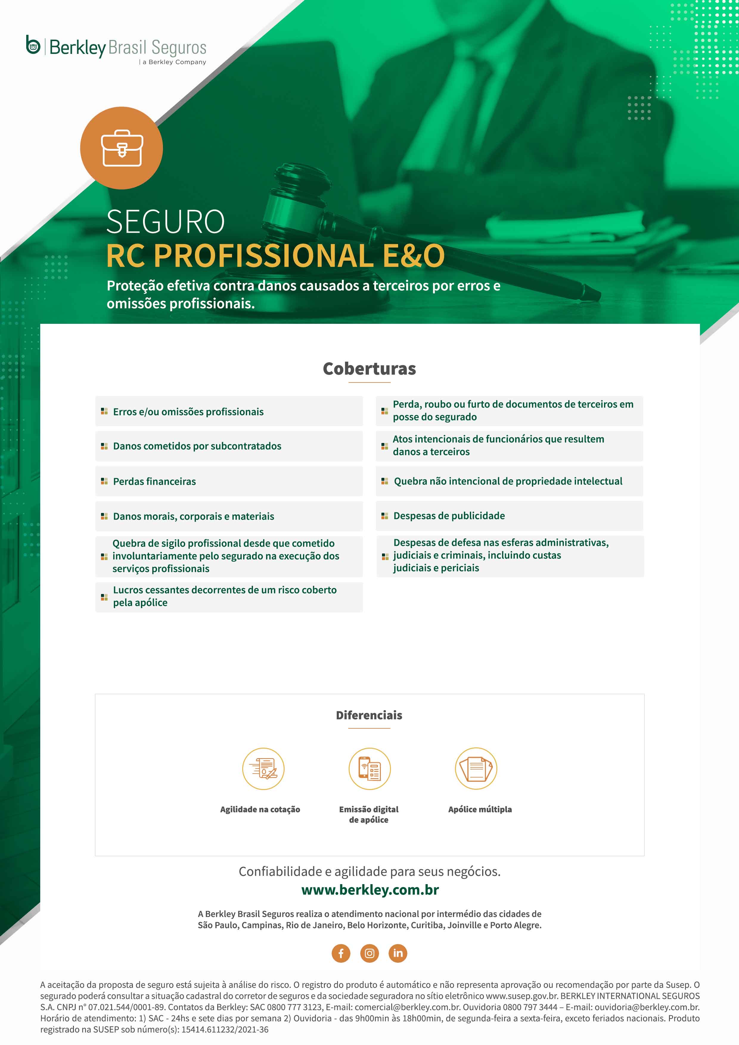 A aceitação da proposta de seguro está sujeita à análise do risco. O registro do produto é automático e não representa aprovação ou recomendação por parte da Susep. O segurado poderá consultar a situação cadastral do corretor de seguros e da sociedade seguradora no sítio eletrônico www.susep.gov.br. BERKLEY INTERNATIONAL SEGUROS S.A. CNPJ n° 07.021.544/0001-89. Contatos da Berkley: SAC 0800 777 3123, E-mail: [email protected]. Ouvidoria 0800 797 3444 – E-mail: [email protected]. Horário de atendimento: 1) SAC - 24hs e sete dias por semana 2) Ouvidoria - das 9h00min às 18h00min, de segunda-feira a sexta-feira, exceto feriados nacionais.