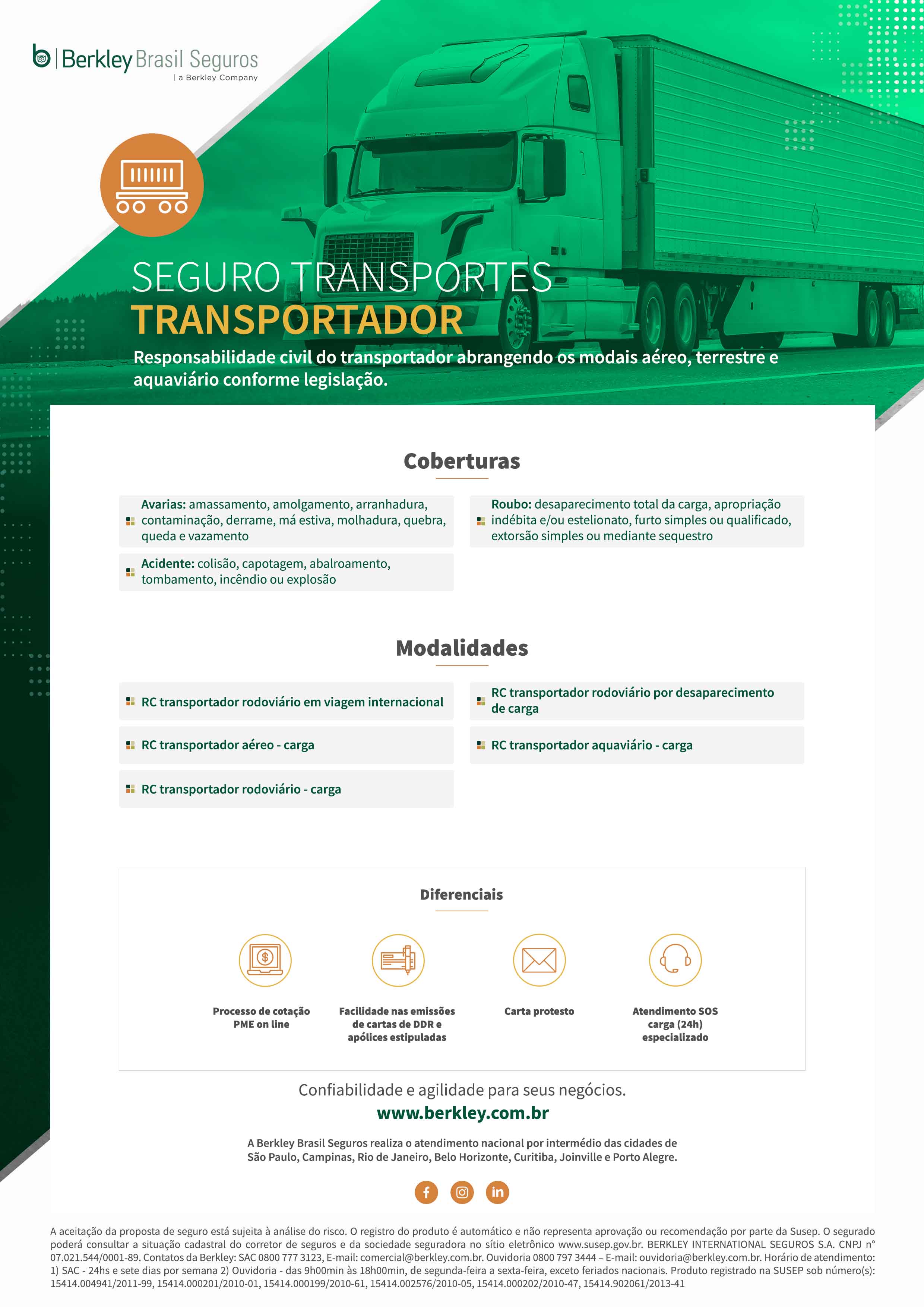 Operando desde 2006 no país, a Berkley Brasil Seguros realiza o atendimento nacional por intermédio das cidades de São Paulo, Campinas, Rio de Janeiro, Belo Horizonte, Curitiba, Joinville e Porto Alegre.